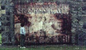"Second Law" (shown here), Peter Russell's billboard size enlargement of eroded sandstone gravestones, explores the inevitability of decay. That a law, suggesting lasting truth, should hold that disintegration is the natural order of the universe is parallelled in the decay of that image.