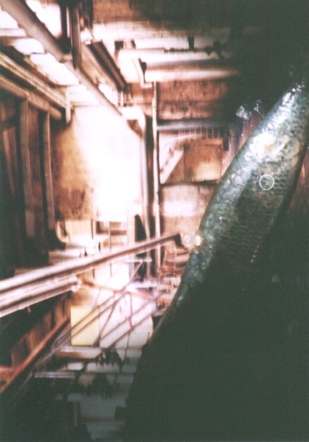 | The first part of the project was to look, to experience, to sense and to be aware. With my camera, I visited sights around the Panzerhalle taking images of decay, destruction and squalor. I began to photograph the reflections in the broken windows around the site. What interested me was what was being reflected back through the glass. The images were shimmering with light as if under water, slightly distorted, abstract and dreamlike. I began to photograph the photographs, creating layers of images. I work with fish and meat because the represent elements of life. They are the raw resources, life forces. The photographs are not quite what they seem... | |